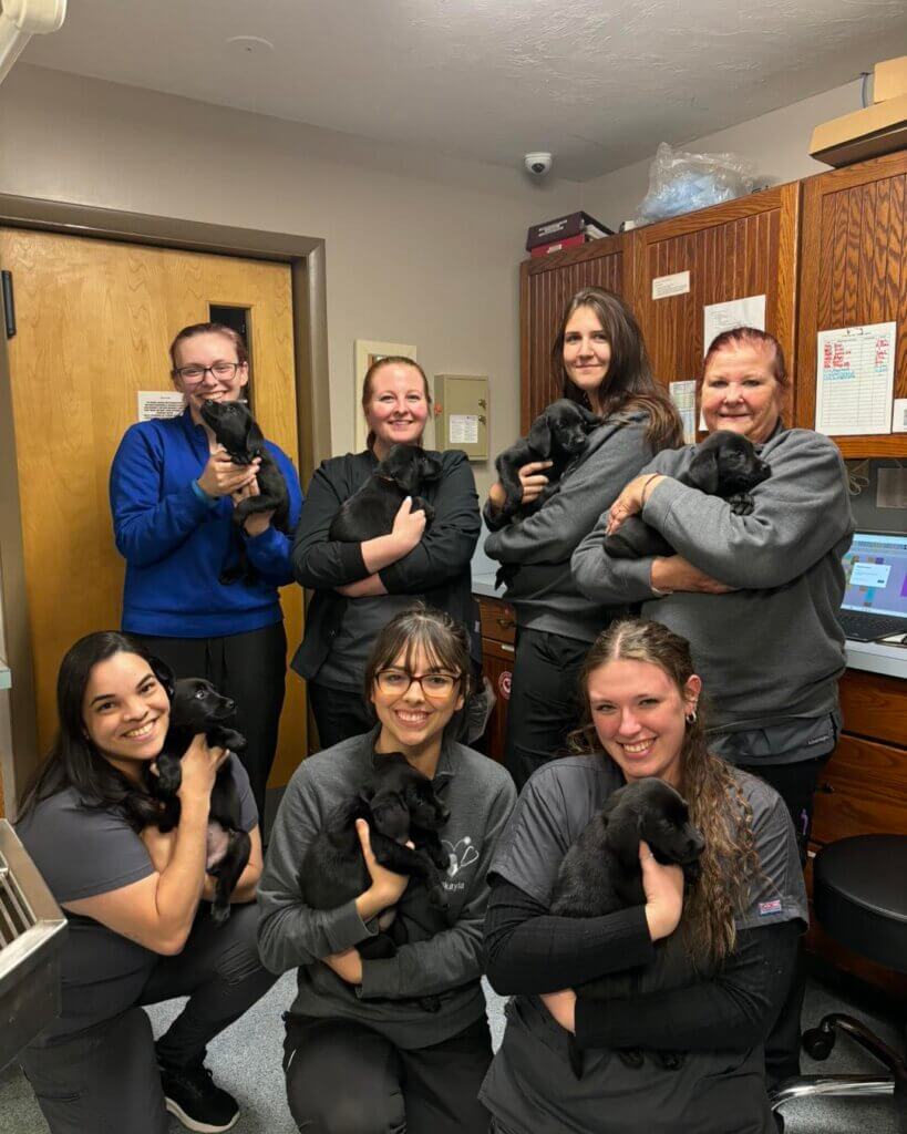 In case you’re not sure yet if you want to meet us: we also giggle a lot, eat snacks at regular intervals, loan each other scrubs when we get poop on us, and spend a huge amount of time crawling around on the floor with cute animals. Sometimes we dance, sometimes we sing karaoke, and sometimes we cry on each other after a rough day. We don’t think there’s any other way we’d want to do this job.